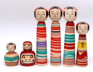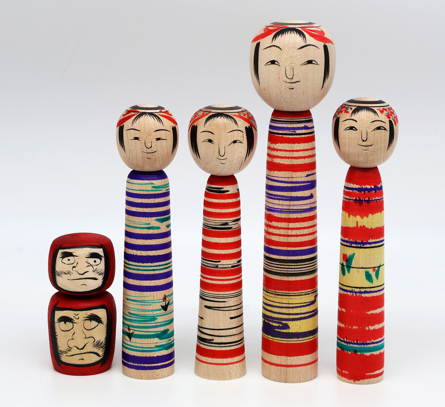 〔左より えじこ(7.0cm)、二段だるま(7.5cm)、18.0cm、18.0cm、18.0cm、15.0㎝(令和7年)(中根)〕