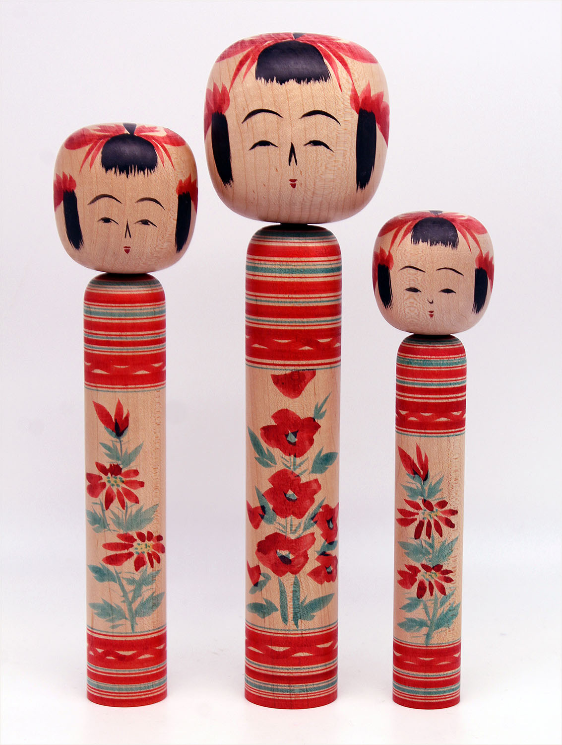 〔人物〕小林はつえは戦後のこけし界を代表する工人のひとりである小林清次郎の妻である。写真のこけしは3本共、小林はつえの描彩こけしで胴底に「はつえ 57.9.23」と署名されている。山形の収集家、故・舟山達旧蔵品で保存が良くはつえ名義としては初作となる。はつえの略歴は「こけし手帳」359号(平成3年2月号・東京こけし友の会発行)の「清次郎夜話」の中に舟山が記述している。