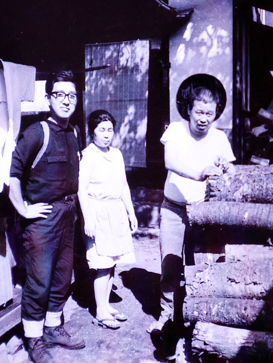人物写真であるが、昭和43年8月、円応寺町の小林家の庭で収集家の箕輪新一が撮影したもの。向かって右から清次郎、はつえ、収集家の橋本正明である。左が吉三郎の家、奥が昭和31年に新築した清次郎の家、右がイタヤカエデ材。大学生だった箕輪、橋本両名は夜行列車で山形へ行き、清次郎宅を訪問すると「まんま、まだだろう?」と言われ、丸いちゃぶ台にはつえが朝食を用意してくれた。箕輪新一によると、橋本正明の向って左に干されているのは吉三郎の愛用していた羽織である。訪ねて来る若者を大切にした吉三郎は木地屋の歴史や心意気を丁寧に語ったらしい。吉三郎の心意気は清次郎とはつえにも受け継がれ、訪ねて来る愛好家を大切にした。そのような背景もあり熱心な愛好家に懇願され、はつえは久々に筆を持ったのだろう。